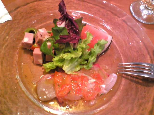 前菜盛り合わせの図。黒大根というのが珍しかった。夫はデカンタで赤ワインを飲んでいたが、私は終始お水でした。最近ではもうアルコールって何だっけ?という感じ。飲めるようになる頃にはかなりお酒弱くなってることでしょう。(すぐ慣れるだろうけど)他はパスタとデザート+コーヒーで1500円。かなりボリュームあった。